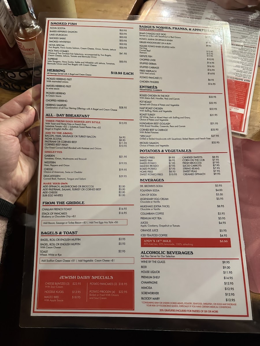 The menu features classic deli staples like the corned beef and pastrami sandwiches, served with a side of crisp coleslaw and tangy pickles. For those looking for something lighter, dishes like the old fashioned chicken consomme provide a warm, soothing option. Potato pancakes and sweet potato fries offer a familiar, satisfying accompaniment that fits well with the diner’s welcoming atmosphere.